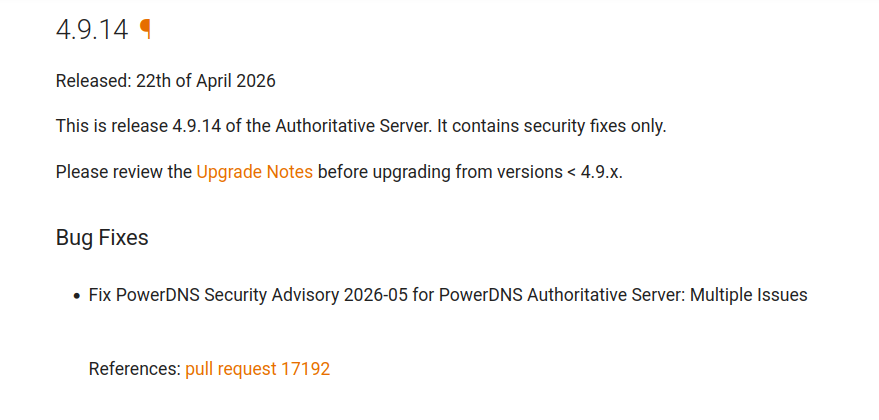 Looking closer at the changelog on the PowerDNS website reveals that this version (4.9.14) was released today (!) and is a security release. It fixes multiple issues including CVE CVE-2026-33257. The Security Advisory 2026-05 reveals more information about the vulnerabilities.