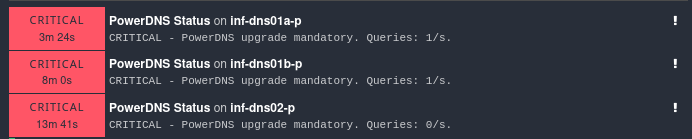 CRITICAL - PowerDNS upgrade mandatory. Queries: 0/s.