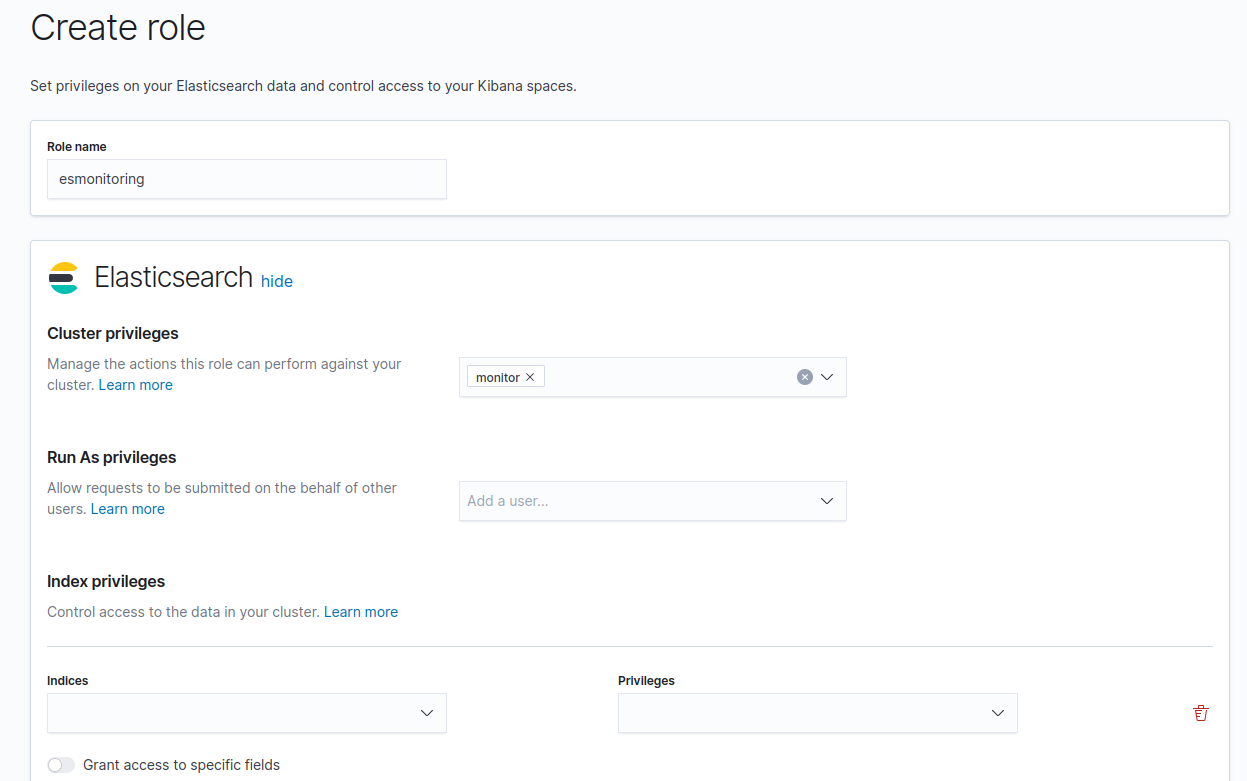 If you are using authenticated access to Elasticsearch, the user needs 'monitor' cluster privileges. The easiest way to do this is to use Kibana to create a new role (here named esmonitoring) with the 'monitor' cluster privilege: